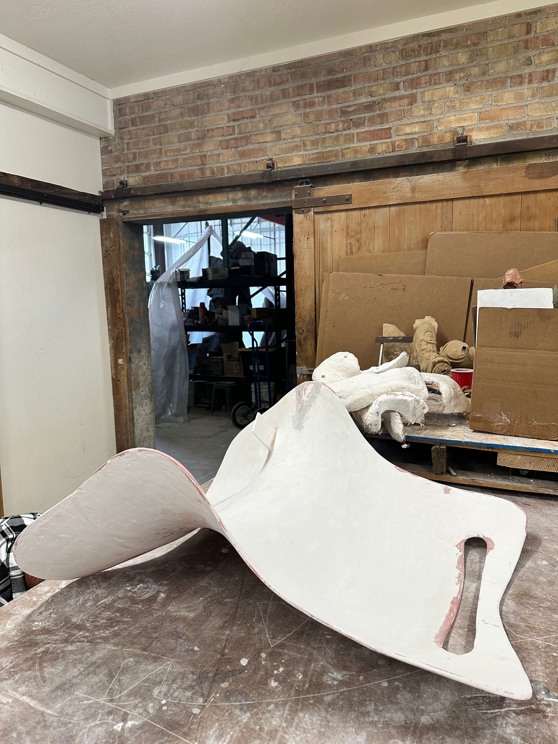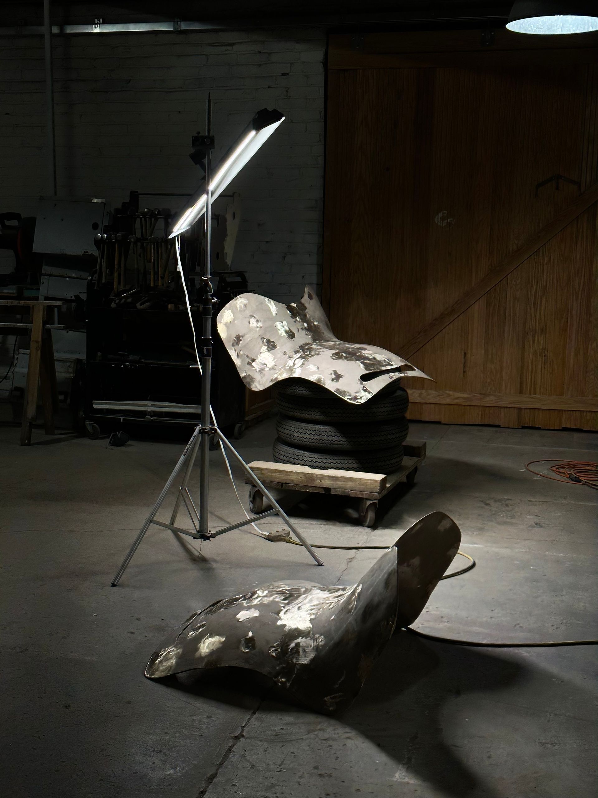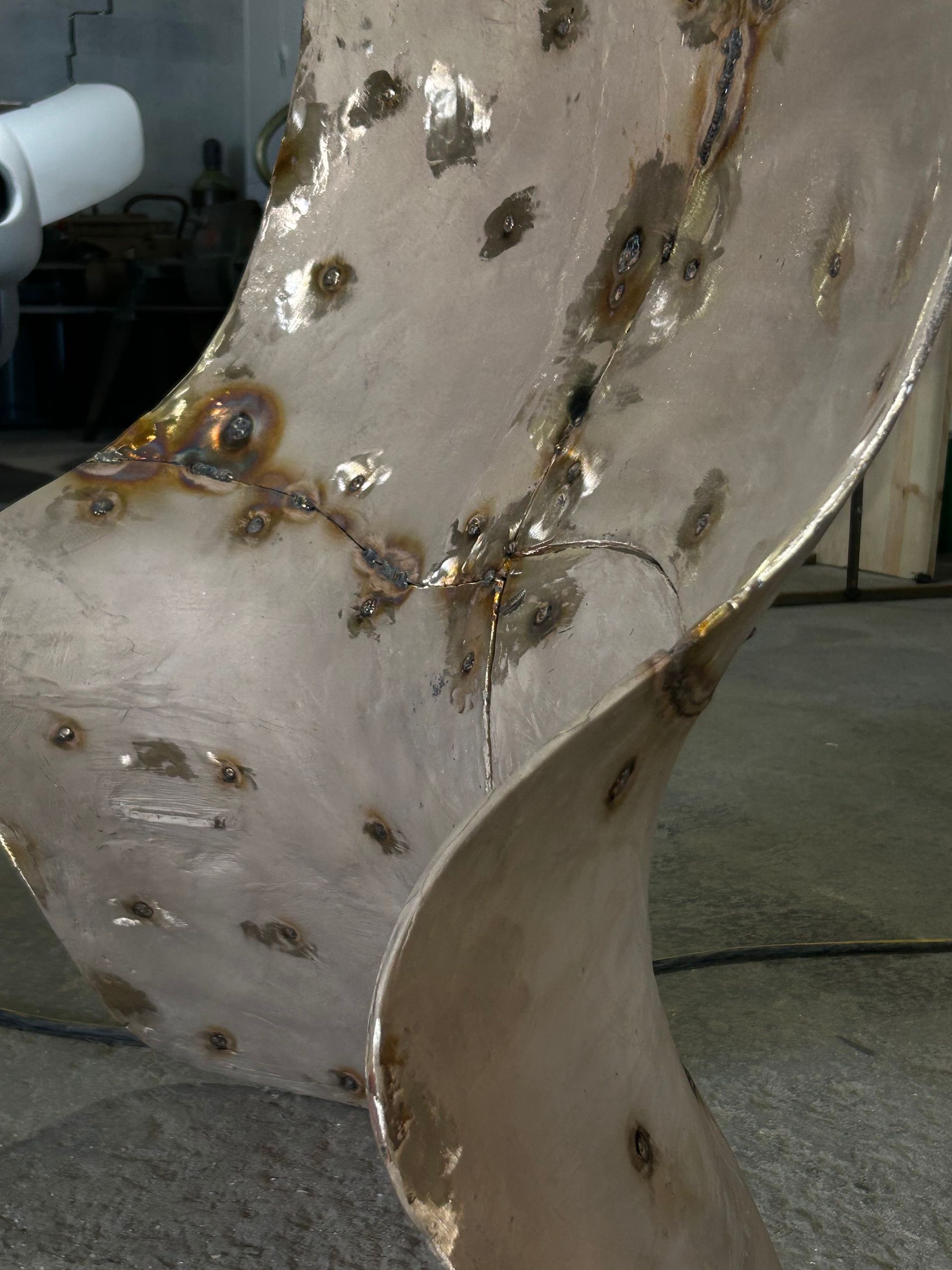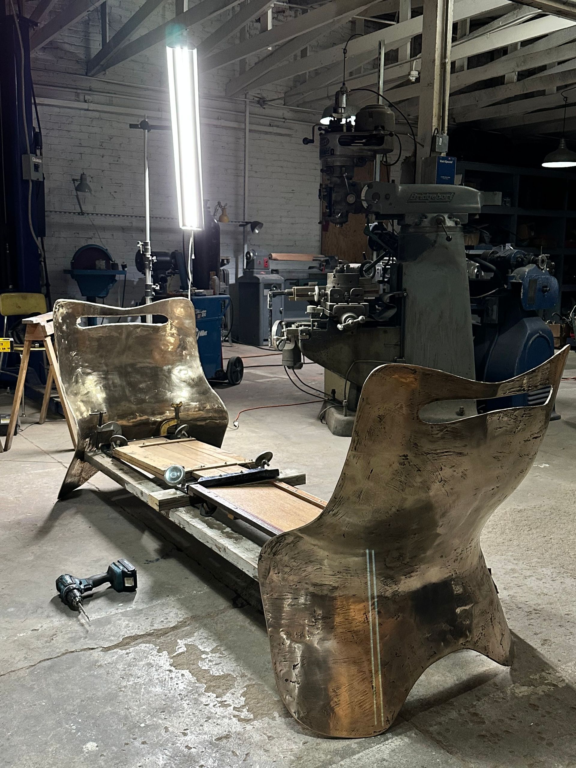 A piece with this amount of complexity in form needed to be rendered digitally first to ensure it had the engineering to hold the weight of itself and the upholstered portion attached. Once the shape resembled what I had originally sketched in the desert—a 3D print of it was created. This print was just a skeleton to the final form intended. I added layers of Bondo and Plaster of Paris to the 3D print, sanding after each layer to sculpt the shape as it felt right. It was important to not cover the plastered piece in wax before it entered the molding process, which is a typical first step to blend out any imperfections. I wanted to keep the natural texture of the plaster—some of the parts that came to the surface from sanding, the brush strokes, and organic edges. The form took a lot of its shape on its own—how the plaster laid on the surface and what I felt right to subtract from the form in the sanding process. After the plaster piece was molded, it went through the complex Lost Wax process of waxing, spruing, ceramic shelling, de-waxing, firing, casting, then de-shelling. Tanner and I moved the pieces to his shop each end was cut into four sections. Tanner welded the four sections together. I ground down the left over spruing, welds, and imperfections of the piece. There were parts of the original shape that needed to be adapted—more grinding and sanding were needed to achieve the desire final shape. This began the bronze sculpting process which started to inform the final shape this piece would take. The bronze piece then went through a multi-step process of sanding from low to highest sandpaper grit to create a high-polish piece. A Scotch Brite pad was used as the final step to take it back one luster from a mirrored finish.