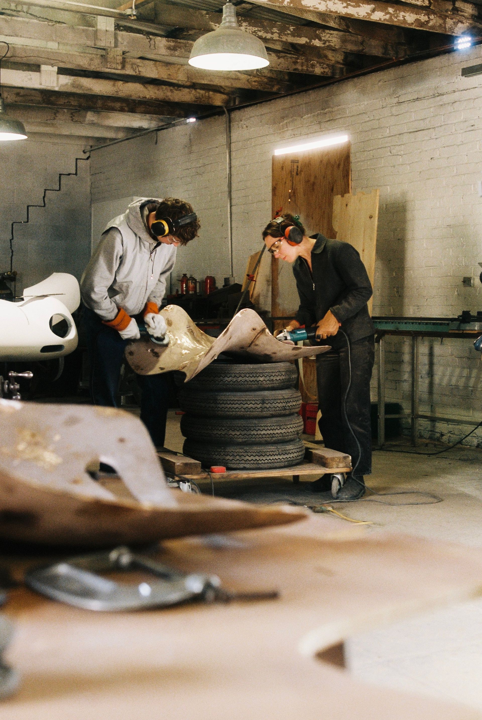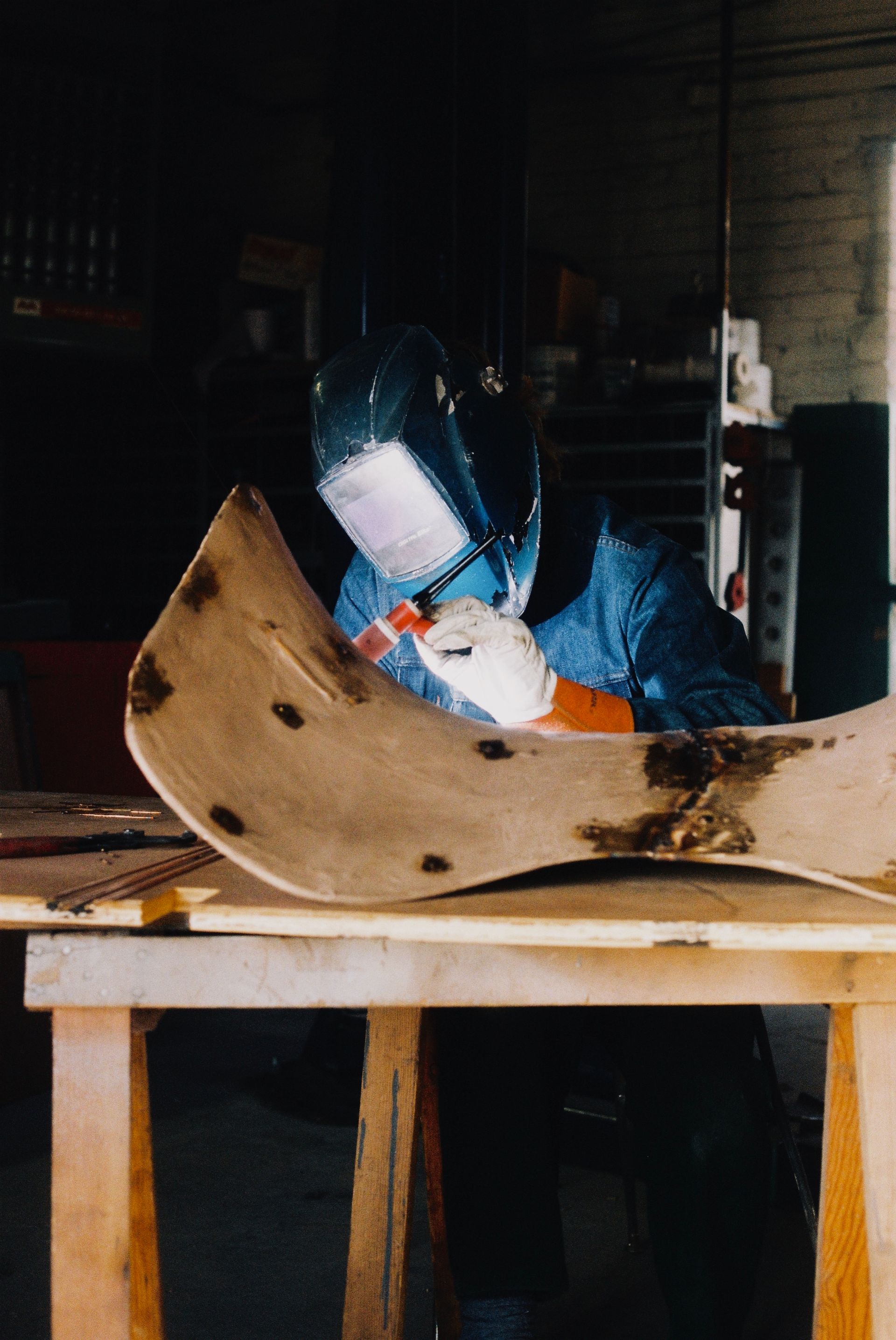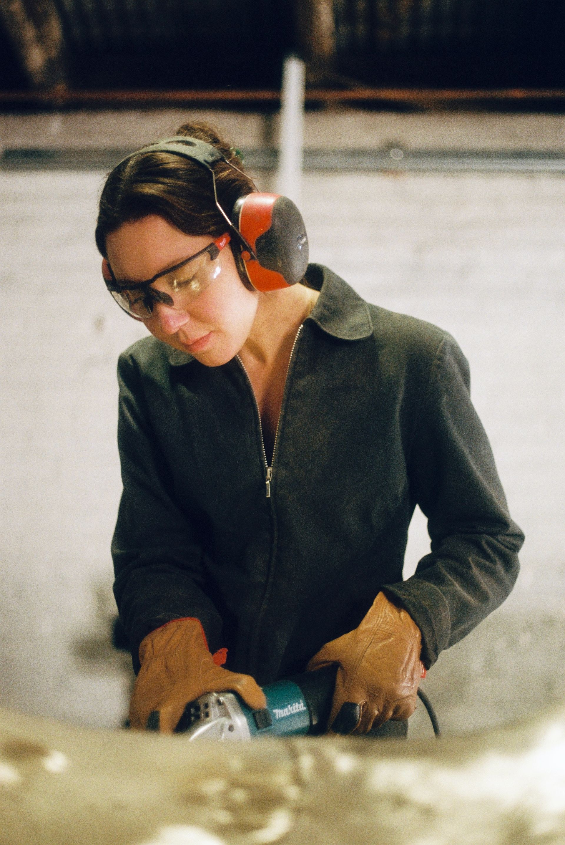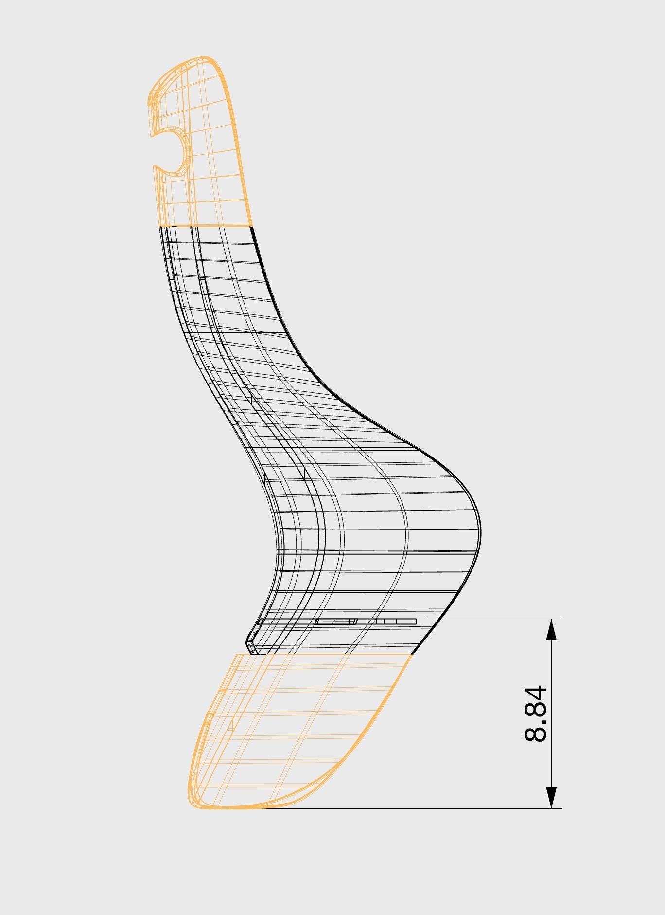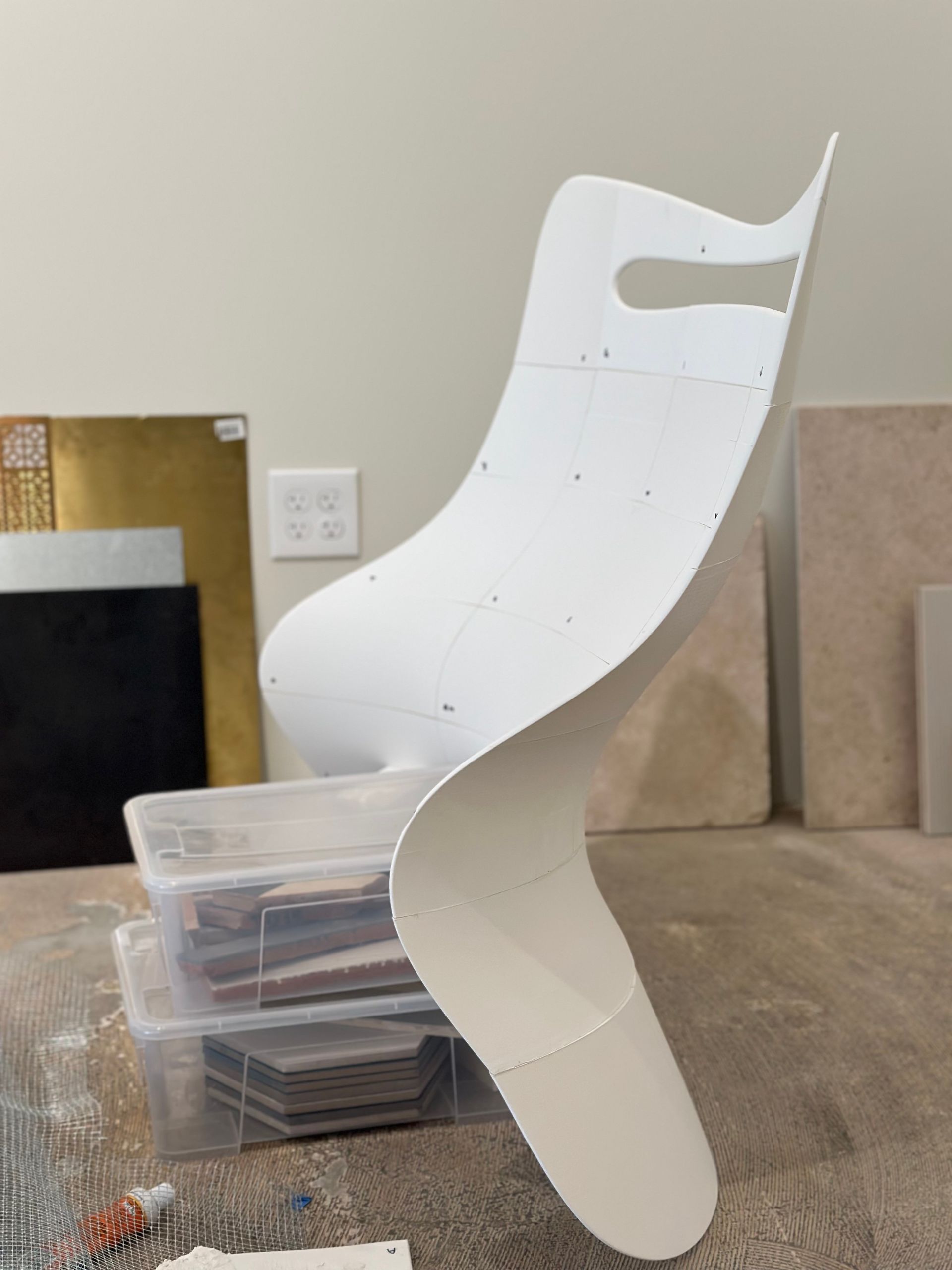 A piece with this amount of complexity in form needed to be rendered digitally first to ensure it had the engineering to hold the weight of itself and the upholstered portion attached. Once the shape resembled what I had originally sketched in the desert—a 3D print of it was created. This print was just a skeleton to the final form intended. I added layers of Bondo and Plaster of Paris to the 3D print, sanding after each layer to sculpt the shape as it felt right. It was important to not cover the plastered piece in wax before it entered the molding process, which is a typical first step to blend out any imperfections. I wanted to keep the natural texture of the plaster—some of the parts that came to the surface from sanding, the brush strokes, and organic edges. The form took a lot of its shape on its own—how the plaster laid on the surface and what I felt right to subtract from the form in the sanding process. After the plaster piece was molded, it went through the complex Lost Wax process of waxing, spruing, ceramic shelling, de-waxing, firing, casting, then de-shelling. Tanner and I moved the pieces to his shop each end was cut into four sections. Tanner welded the four sections together. I ground down the left over spruing, welds, and imperfections of the piece. There were parts of the original shape that needed to be adapted—more grinding and sanding were needed to achieve the desire final shape. This began the bronze sculpting process which started to inform the final shape this piece would take. The bronze piece then went through a multi-step process of sanding from low to highest sandpaper grit to create a high-polish piece. A Scotch Brite pad was used as the final step to take it back one luster from a mirrored finish.
