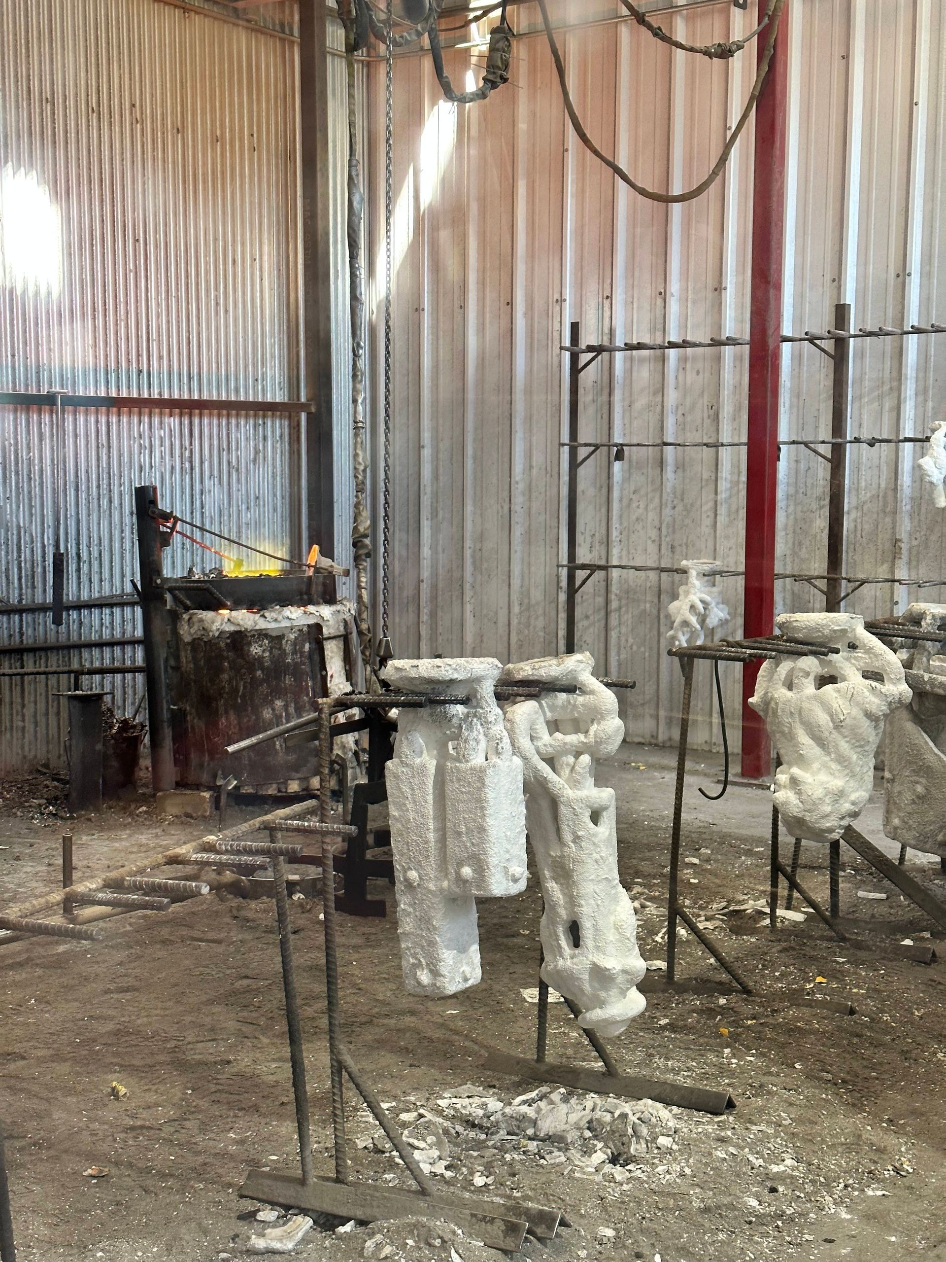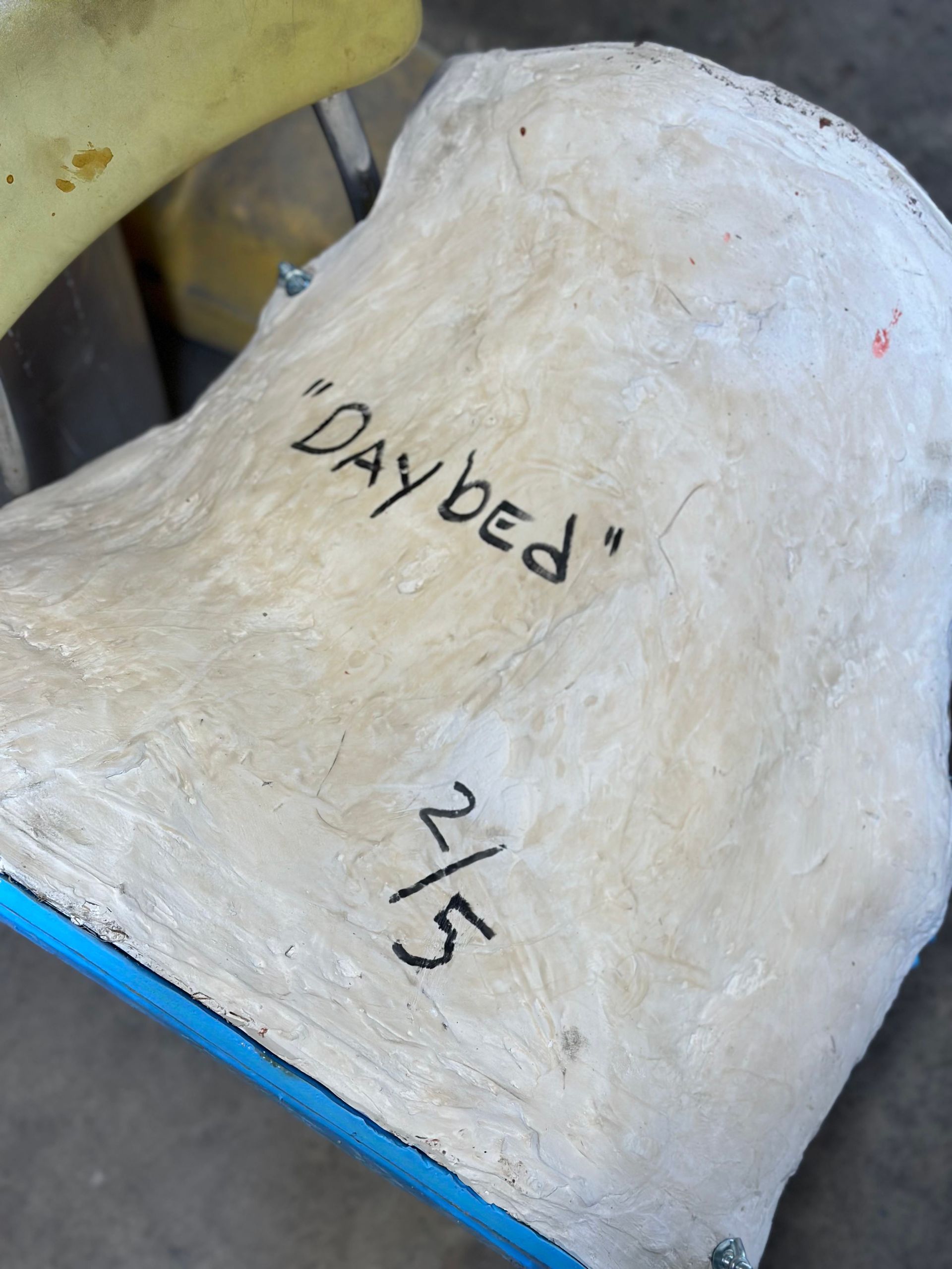 The idea for this project came from my introduction to Tanner Boyes, who had helped another furniture designer create a complex curved aluminum lounge collection. Tanner had equipment and tooling that were rare and connections to a foundry in Springville, Utah, that creates Lost Wax casts for bronze sculptures. I knew the piece I wanted to create was unique in form, also complex in curvature. As I explored my fabrication options, it made the most sense to try to create this daybed in a foundry. The shape of the daybed occurred to me during my solo trip to Boulder, Utah, where I went to find inspiration of form from the red rocks that had been carved from thousands of years of water and wind. I laid my body on the rock formations, studying form in relation to my body. I sketched the original form of the bronze daybed in the desert in June 2023. The initial form was easy to develop, inspired by nature. But the complexity of the process taught me how to communicate in terms of technical furniture engineering and how to be a sculptor of plaster and bronze.